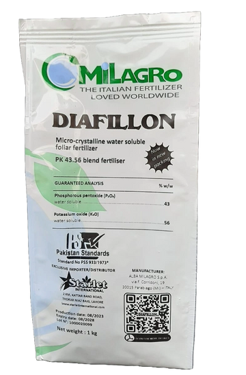 Diafillon® is a fertilizer recommended for all crops when high amounts of effective phosphorus and potassium are needed. At the beginning of growth, it promotes the development of the roots and the hardening of green tissues. It improves and brings an early flowering, increasing the fertility of vegetables, fruit trees and ornamentals. Diafillon® is also very effective on vegetables and fruit trees in the final phase of fruit ripening. Brix, consistency, color and post-harvesting shelf-life.