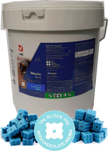 A ready to use highly palatable rodenticide bait based on the potent anticoagulant, Brodifacoum equally effective against rats and mice. It is designed to be effective against rodents that are reluctant to feed from traditional grain baits. A blue hexagonal block with a central hole allows each 10g block to be anchored securely in baiting points to prevent a rodent from dragging it away. Single feed is enough to produce delayed mortality. It can be used in and around buildings and in sewers.