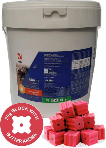 A ready to use highly palatable rodenticide bait based on the potent anticoagulant, Bromadiolone equally effective against rats and mice. It is designed to be effective against rodents that are reluctant to feed from traditional grain baits. A Red block with a central hole allows each 20g block to be anchored securely in baiting points to prevent a rodent from dragging it away. Single feed is enough to produce delayed mortality. It can be used in and around buildings and in sewers.